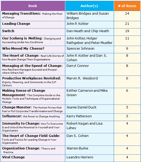 I must remember that these recommendations are mainly from change practitioners, which is not my target audience of leaders looking for practical help. That being said, the list does point to a few resources that are the most valued and most likely ‘relevant’.